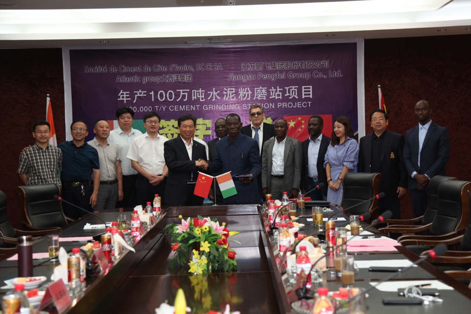 The signing ceremony of 1,000,000tpa cement grinding station project between Atlantic Group and Jiangsu Pengfei Group is held on 20th July, 2017. Commercial consellor of the ivory coast embassy in China, Mr. KOUADIO Kouame, President of Atlantic Group Mr. Kone Dossongui, CEO of Atlantic Group Mr. Georges Wilson, the Director of the Standing Committee of the People’s Congress of Hai’an Mr. Zhou Zongquan, Vice Country Mayor Mr. Zhang Yuanchun, President Wang Jia’an, Deputy Director of Commercial Bureau Mr. Zhang Qinghua and other honored guest from central African foundation attended the signing ceremony.