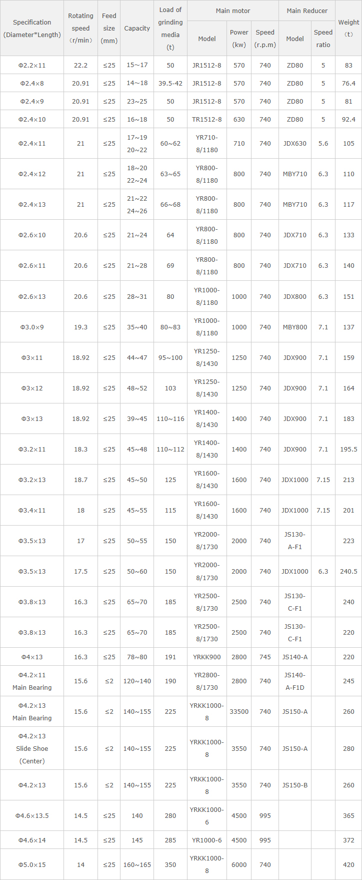 Shell This ball mill is horizontal shell rotating device, mainly consist of shell, mill door and liner bolts. So we required to check the mill when shut down, especially to check the liners on shell and mill door. Liner The liners are used for protect shell in order to avoid damage to shell, please check liners regularly to avoid any loose because of bolts etc. Diaphragm Diaphragm is used to separate grinding media to avoid axial movement of media and large size move to next chamber. It can make suitable grinding for materials and control filling grade, material flow, and grinding speed inside mill. Diaphragm plate is consist of central circle, feed cone, grate plate, lifting plate, liner, diaphragm support and blind plate. Please check if there is any loose, missing of bolts, to check the condition of grate plate and blind plate, if there is any crack or influence to grate plate and check if there is any movement of balls. Main bearing Bearing is used to bear the weight of rotated part also impact of grinding media. The mill is supported on main bearing by hollow shaft. There is bearing cover, watch hole, temperature gauge on bearing housing. Feeding and discharging device Feeding device is used to feed materials into mill, there is chute feeding device, screw feeding device and ladle feeding device. The discharging device is consist of discharging grate plate, guide cone, lifting plate, discharging cylinder, drive connecting tube,drum screen, discharging cover, coarse tube etc. Drive device Drive device is consist of speed motor, slow drive motor, slow reducer and speed reducer. Mainly check: if there is any overheat and noise of reducer oil pump. And check working condition of each elements such as pressure gauge, temperature gauge, and if there is any oil leakage, oil level and oil color of oil tank. Please adjust oil flow as per weather condition; check if there is any noise of main oil pump etc. | |