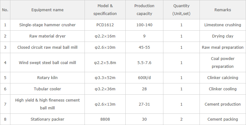 | The main equipment of cement production line including: rotary kiln、cyclone preheater、cooling machine、Crusher, vertical mill, roller press, cement mill, coal mill, dryer, dust collector, packaging machines, bulk machines, conveyors, electrical control etc. | |